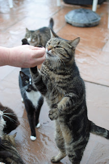 Cheetah is now around eight or nine years old. He’s turned into a friendly boy, though he can still be scared if startled. He is quite fond of treats, as Brigid demonstrates: