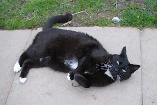 Two weeks in a row he did the sidewalk wriggle for me. This evening it must have given him a case of the cat equivalent of the giggles, because once he’d had his fill of wriggling, he leaped up and started bounding goofily around the enclosure, pausing every now and then to see if I was still looking.