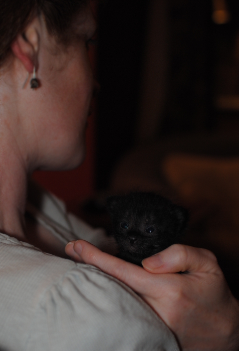 … and how much more cat-like they act. Vincent and Ayako came along to join in the kitten feeding and socializing effort. The kittens were delighted and Vincent’s charge expressed its happiness in true cat fashion by happily digging in its tiny little claws. I didn’t get a picture, but Ayako later captured the moment in one of her wonderful kitty sketches.