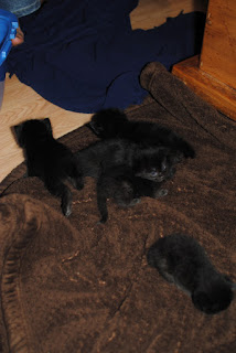 They’ve already gotten pretty good at clambering (all the practice climbing over mom), but Ann’s now put down a nice, soft blanket so they can start using those little legs for some supervised walking/stumbling around.
