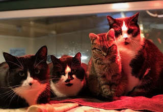 The favourite place on the DW Deck is on a mattress, built out in an area that overlooks the volunteer tea-room below. The heat lamp hanging over it gives a secondary name to the area – the Cats Red Light District. Bodhi, Hamlet and Luke were introduced last week as the core members of the feline band PURR . But volunteer Daphne Jorgensen has been visiting with them regularly, and feels they need to push the boundaries a bit more. Daphne posts regularly for our Staff/Volunteers closed page, but with her permission, I’ll share some of her musings on the DW deck inhabitants…