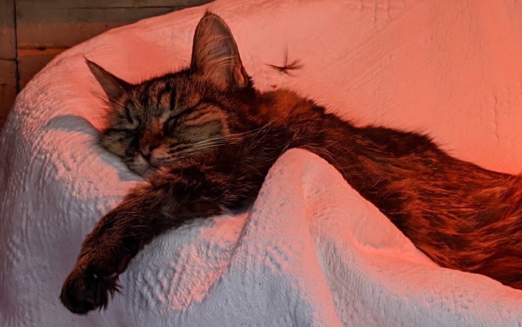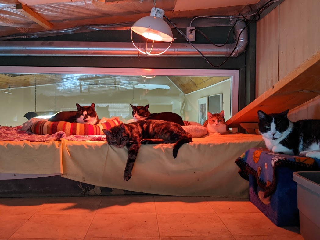 Often the shyer cats prefer not to be inside one of the buildings, but are willing to compromise by living on an enclosed deck. When the weather is chilly, they can find warmth on an enclosed shelf, or, if they’re lucky, in a basket or a papasan chair under a heat-lamp. Once a new cat is released from its cage in the Double-Wide (DW), it will often make its way to the deck, for an area with good hiding places. Draped chairs and shelves, a walk-way around the wall, and the reassurance that there won’t be many visitors gives cats the chance to settle, and eventually allow contact.