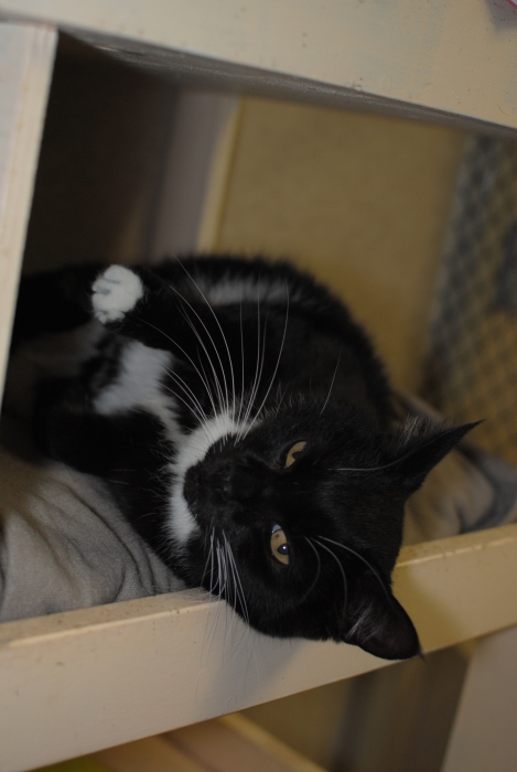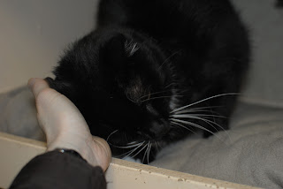 It’s wonderful to see these formerly shy kitties turn into wriggling, purring love balls. The hope now is that it’ll stick once they’ve been let out of the cage. Please visit them while they’re in there so that they don’t forget their decision to like humans once they’re out! If Schatze gets to like us all enough, she may even decide that she can be happy living within the sanctuary and not try to escape out into the parking lot when she gets a chance.
